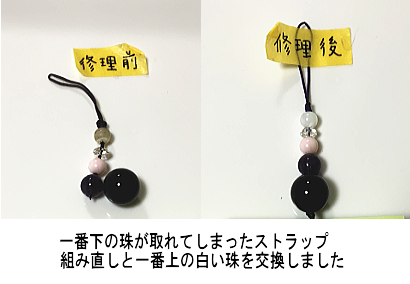 特にストラップは、常に御持ち物につけられる方も多く、石の欠けや紐、ワイヤーの劣化等が発生しやすいものでございます。末永くお持ちいただきたいという思いから、紐、ゴムのお取替えや守護をし続け疲れてしまっている石、劣化している石のお取替えもさせていただきます。 (希少な石の場合、お取替えできない場合もございます。その折にはご連絡させていただきまして対応のご相談をさせていただきます)